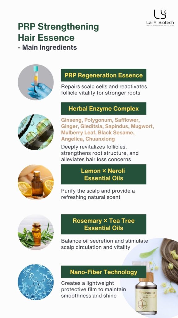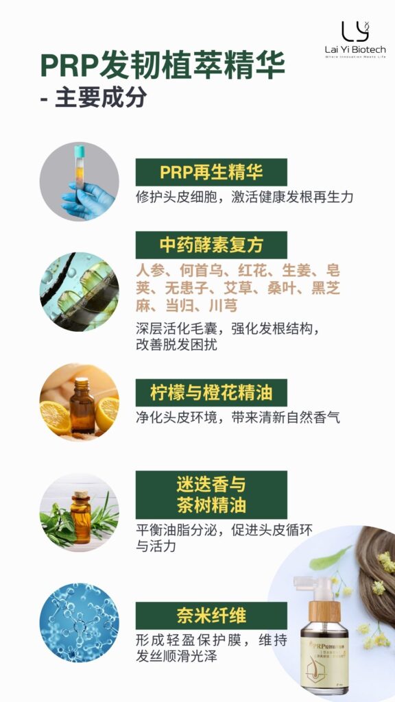 PRP、中药酵素(人参、何首乌、红花、生姜、皂荚、无患子、艾草、桑叶、黑芝麻、当归、川芎)、柠檬、橙花、迷迭香、茶树、奈米纤维